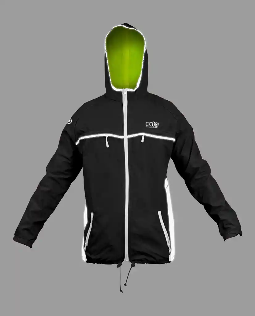 Rompe-vientos impermeable con puntos de respiración frontal, puntos reflectivos laterales y al borde de la chaqueta, cremalleras impermeables y bolsillos laterales externos.