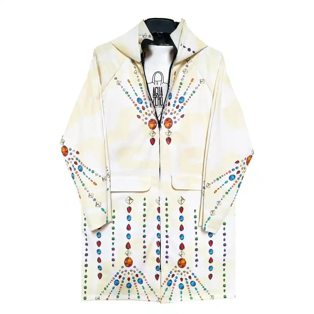 Vístete con una prenda excepcional de exterior con estampado exclusivo, 100% Impermeable, confeccionada por sellos al calor, con dos bolsillos delanteros, capota y cremallera doble vía se incluye maleta para transportar. Largo chaqueta arriba de la rodilla.
