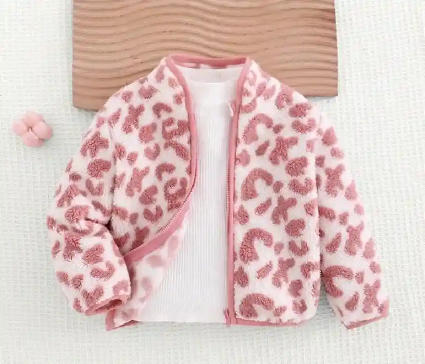 Talla disponible : 6 -9 meses máximo abrigo para tu pequeña! Esta chaqueta tipo ovejera es la prenda infaltable para proteger a las niñas del frío con un diseño moderno y tierno. • Textura Ultra Suave: Confeccionada en material tipo peluche (sherpa/ovejero) que brinda una sensación de suavidad premium al tacto. • Protección Térmica: Ideal para mantener la temperatura corporal en días fríos o salidas nocturnas. • Diseño Chic: Estampado de leopardo en tonos rosa y crema, perfecto para combinar con jeans o leggings. • Detalle Funcional: Cremallera frontal reforzada y cuello alto para mayor cobertura contra el viento.