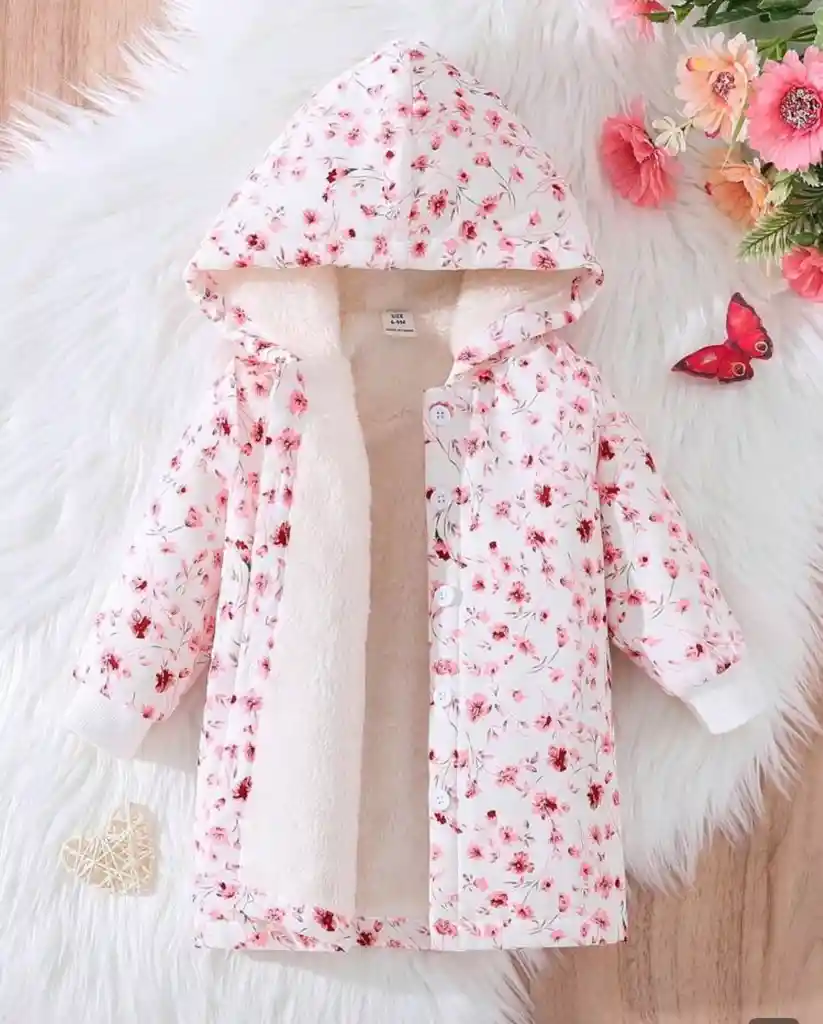 Máxima protección con el diseño más dulce! Este gabán térmico es la pieza definitiva para los días más fríos, combinando un exterior encantador con un interior ultra cálido. • Interior Ultra Térmico: Totalmente forrado en material tipo ovejero (sherpa) de alta densidad, incluyendo la capota, para mantener el calor corporal. • Diseño Largo Tipo Gabán: Brinda mayor cobertura que una chaqueta convencional, protegiendo también la zona de la cadera y piernas. • Estilo Floral Delicado: Estampado de pequeñas flores rosadas que aportan un aire tierno y primaveral. • Funcionalidad: Botones frontales fáciles de abrochar y puños elásticos que impiden la entrada del viento.