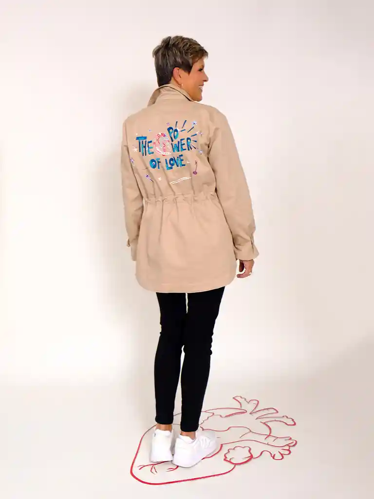 Chaqueta color caqui de cuello solapa y manga larga. Bolsillos delanteros con solapa y de parche. Detalle de cinturón de algodón. Cierre frontal con broches a presión inoxidables, En la espalda lleva una pieza intervenida con tres técnicas: estampado, bordado a mano y maquina, chaquerreteras en los puños bordadas con la frase "the power of love"