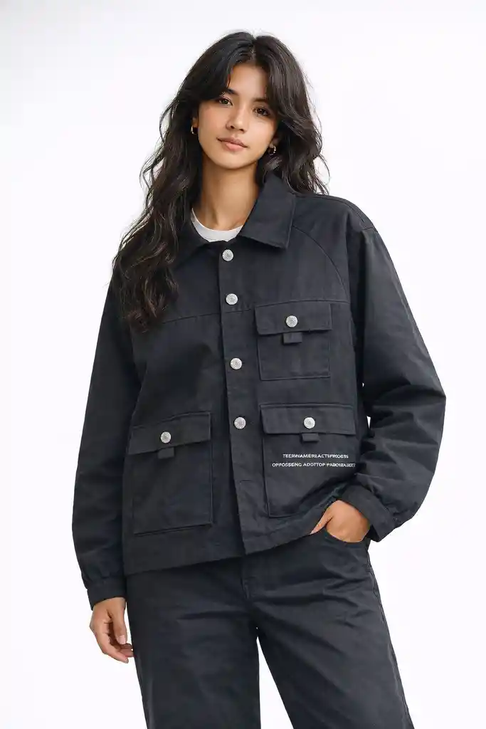 Chaqueta femenina de diseño utilitario con silueta estructurada y corte moderno. Cuenta con cierre frontal de botones, bolsillos funcionales con tapa y cuello clásico que aporta un estilo versátil y atemporal. Ideal para looks casuales o urbanos, combina comodidad y resistencia en una prenda práctica, perfecta para complementar outfits diarios con un toque contemporáneo y funcional.