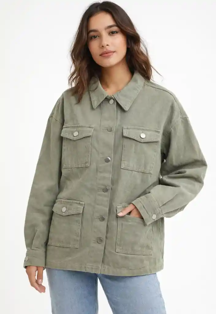Chaqueta femenina de diseño utilitario con silueta estructurada y corte moderno. Cuenta con cierre frontal de botones, bolsillos funcionales con tapa y cuello clásico que aporta un estilo versátil y atemporal. Ideal para looks casuales o urbanos, combina comodidad y resistencia en una prenda práctica, perfecta para complementar outfits diarios con un toque contemporáneo y funcional.