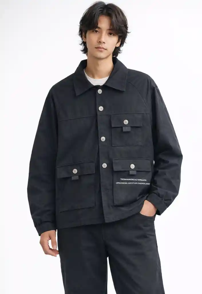 Chaqueta Masculina de diseño utilitario con silueta estructurada y corte moderno. Cuenta con cierre frontal de botones, bolsillos funcionales con tapa y cuello clásico que aporta un estilo versátil y atemporal. Ideal para looks casuales o urbanos, combina comodidad y resistencia en una prenda práctica, perfecta para complementar outfits diarios con un toque contemporáneo y funcional.