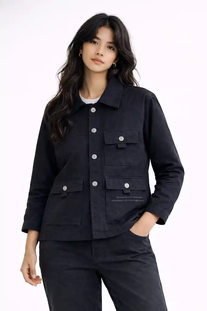 Chaqueta femenina de diseño utilitario con silueta estructurada y corte moderno. Cuenta con cierre frontal de botones, bolsillos funcionales con tapa y cuello clásico que aporta un estilo versátil y atemporal. Ideal para looks casuales o urbanos, combina comodidad y resistencia en una prenda práctica, perfecta para complementar outfits diarios con un toque contemporáneo y funcional.