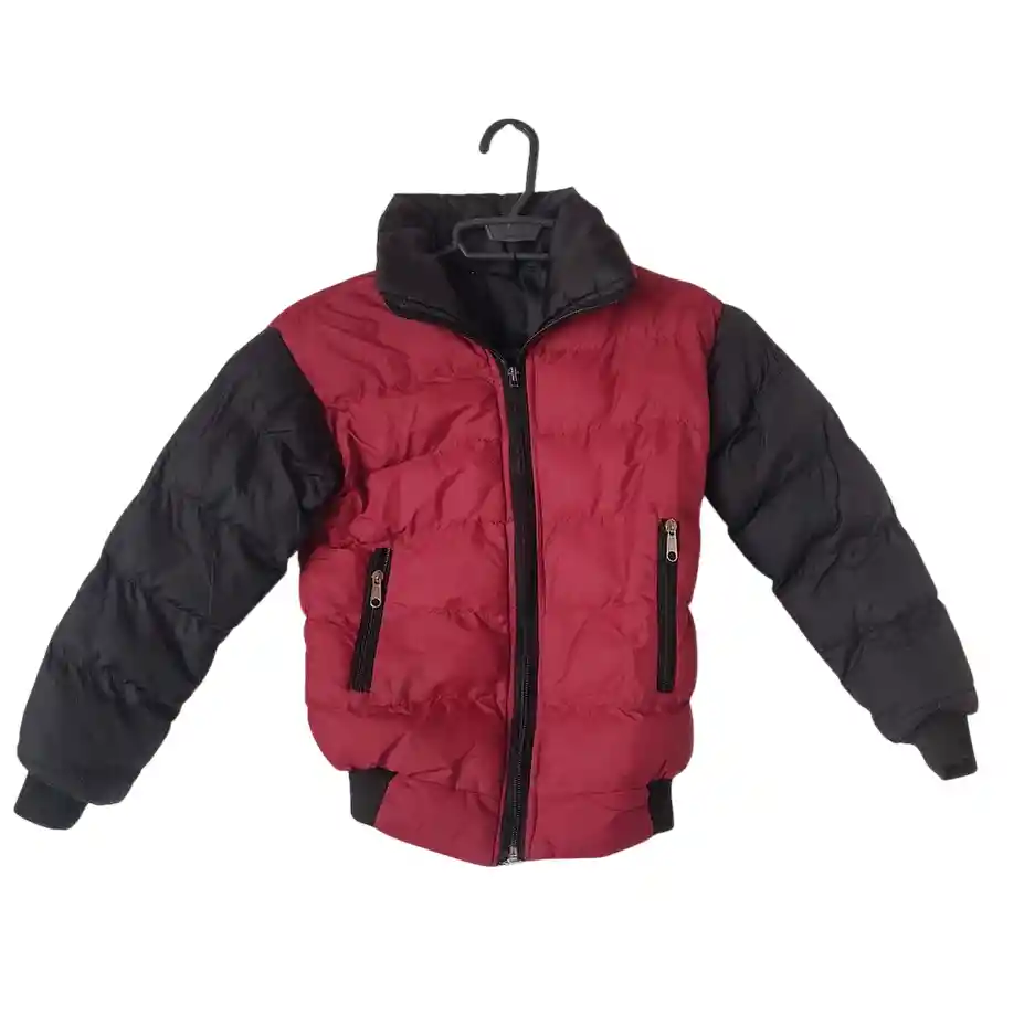 Chaqueta Vino Tinto y Negra para Niño Acolchada Abrigadora Talla 8. Chaqueta acolchada gruesa de color Vino tinto y Negra, Talla 8, abrigadora para niño. Medida de largo: 55 cm