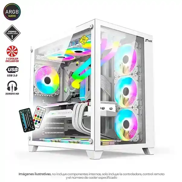 1. Diseño Estilizado: Esta torre ATX destaca con su elegante chasis blanco y vidrio templado, ofreciendo una estética moderna y sofisticada. 2. Conectividad Avanzada: Equipada con puertos USB 3.0 y Type-C (USB 3.0), proporcionando opciones de conexión rápida y versátil para tus dispositivos. 3. Iluminación ARGB Impresionante: Cuenta con 7 ventiladores FN-12ARGB-L WT para una iluminación vibrante y personalizable, distribuidos estratégicamente para un efecto visual impactante. 4. Control Centralizado: Incluye el hub V4.0 ARGB-PWM HUB WT para gestionar de manera eficiente la iluminación de todos los ventiladores desde un solo lugar. 5. Embalaje Seguro: Viene con un paquete de protección EPE para garantizar que tu torre llegue en perfectas condiciones, lista para montar tu PC de alto rendimiento.