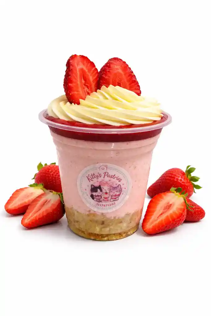 Postre frio cremoso sabor a fresa. Base crujiente de galletas, relleno suave con queso crema, crema de leche y fresas, con deliciosa mermelada de fresa por encima.