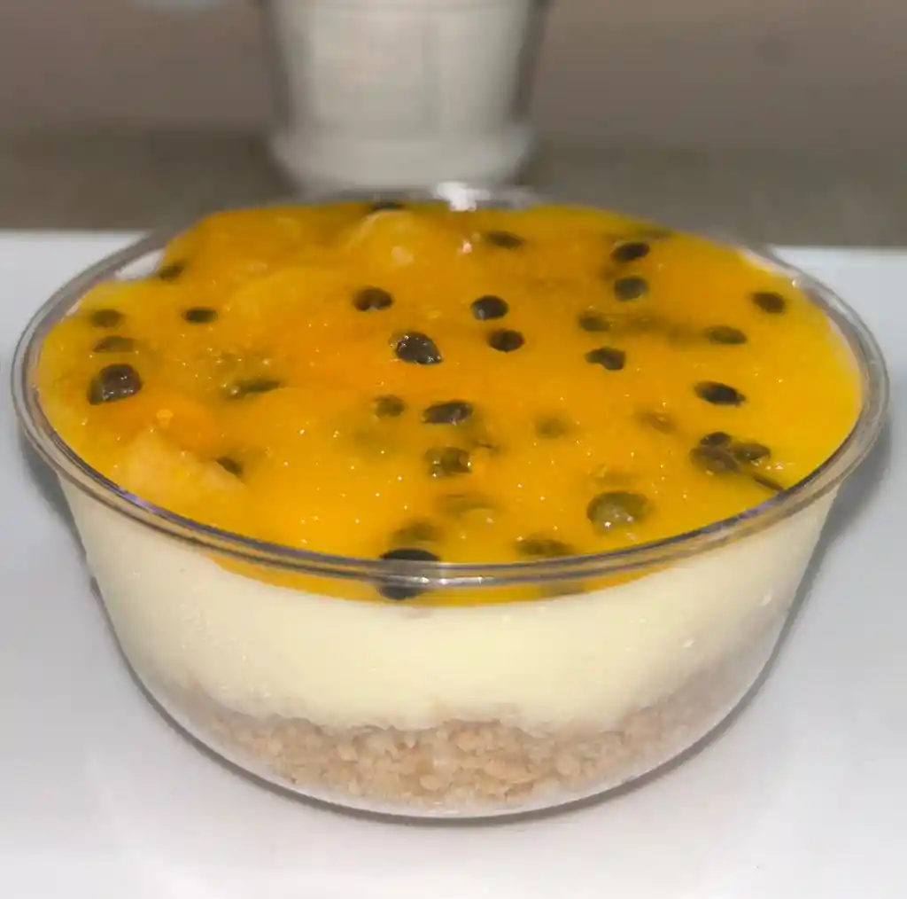 Cheesecake de Maracumango es un postre tropical irresistible. Con una base de galleta, un rico relleno de queso y una jalea de maracuyá y mango que lo hace único, es la opción perfecta para cualquier amante de las frutas exóticas.