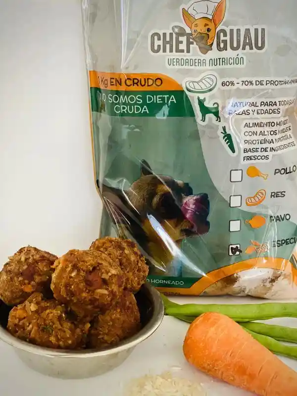 Alimento a base de proteína animal (pechuga, mollejas y corazones), complementado con vegetales (zanahoria y habichuela), proteína vegetal y cereales (arroz), balanceado por veterinarios certificados en nutrición para mascotas.