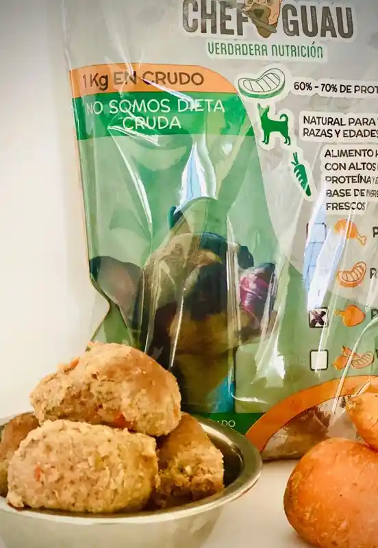 Alimento a base de proteina animal (Carne de pavo magra), complementada con vegetales (Zanahoria y habichuela), proteina vegetal y cereales (Arroz), balanceada por veterinarios certificados en nutrición para mascotas.
