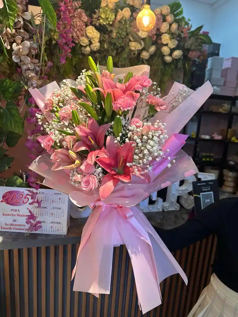 Bouquet de gran formato con una composición romántica en tonos rosados intensos y suaves, complementados con acentos blancos y verdes que aportan frescura y equilibrio. Su diseño combina distintas alturas y texturas, logrando un arreglo elegante, delicado y visualmente armonioso. Está envuelto en papel premium en tono rosa con detalles sutiles, dispuesto en capas estructuradas que realzan su volumen, y finalizado con un lazo satinado que aporta un acabado refinado y sofisticado. Los bouquets pueden tener leves variaciones de flor, pero siempre manteniendo una armonía de tonos.