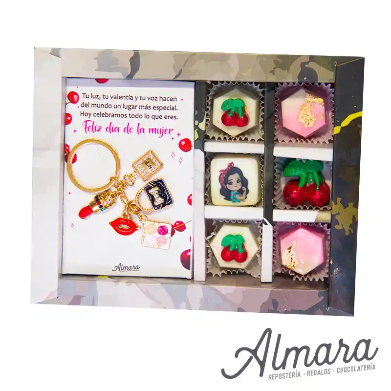 Chocolates Conmemoraciòn dìa de la lucha por lo derechos de la mujer Caja de chocolates Inspirado en cerezas que juntas son mas fuertes y hermosas. Contiene 6 Bombones de chocolates rellenos 1 Llavero metalico con figuras del Bolso, maquillaje sobre cama de cartòn con mensaje alusivo a la celebraciòn. Caja de cartón medidas 10,5*14*3cm