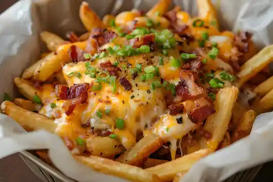 Crujientes papas bañadas en salsa de queso cheddar, tocinos crunch y aros de cebolla.