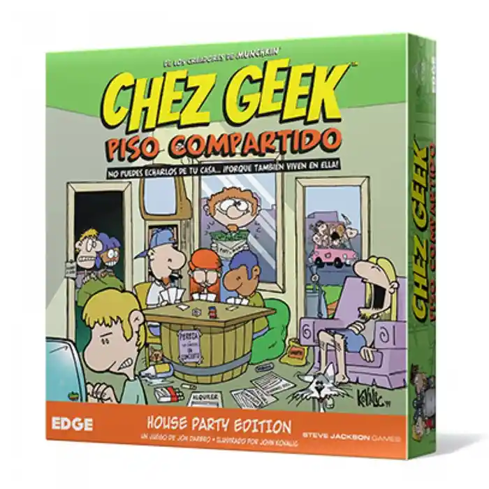 ¿Es tu vida así? Tele, cerveza, un polvete furtivo... la noche del viernes ha llegado a tu lamentable piso de alquiler. Comparte piso con tus amigos - mientras puedas soportarlos. Consigue un trabajo, aunque son todos malos. Gasta tu dinero y tu escaso tiempo libre para acumular puntos de Vagueo. Bebe alcohol barato, pásate por el bar, y juega con tus gatos. Hazle a tus compañeros de piso lo que ellos te hagan a ti. ¿Y qué otro juego te da puntos por sobar? Sólo recuerda, cuando tu compañero de piso y su amiga no te dejen pegar ojo en toda la noche, que no los puedes echar... porque viven allí. La presente edición, House Party Edition, es un juego completo y contiene todas las cartas de Chez Geek: Vagos Comparten Piso, Chez Geek 2: Ataque de Pereza y Chez Geek 3: Block Party. También incluye un dado y contadores de Vagueo.
