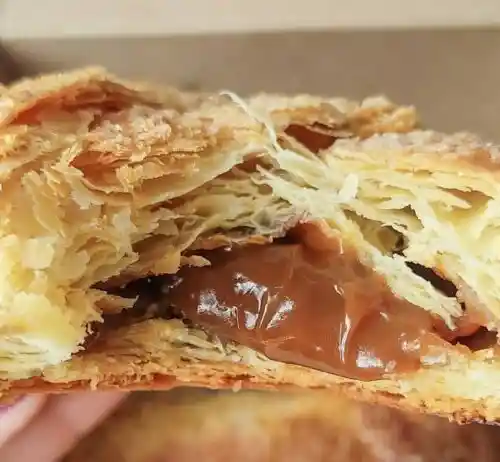 Crocante chicharrón en masa de hojaldre relleno de arequipe.