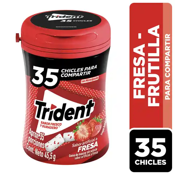 Chicles Trident sin Azúcar sabor artificial a Fresa en botella de 35 unidades.