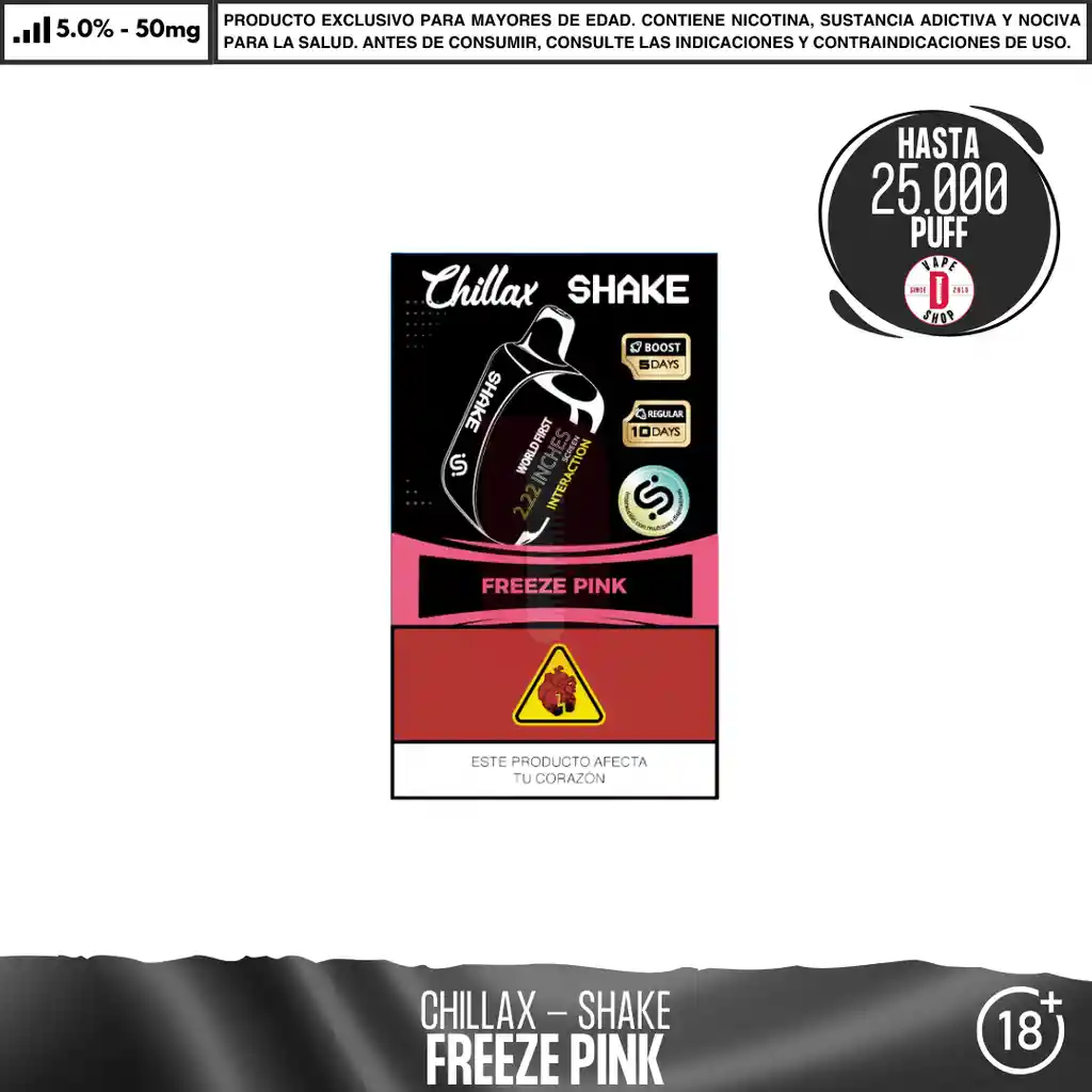Chillax - Shake 25000 PUFF El Chillax Shake 25000 puffs es un dispositivo desechable diseñado para ofrecer una experiencia prolongada con hasta 25,000 inhalaciones. Su construcción compacta y ligera facilita su manejo y transporte, mientras que su sistema avanzado asegura una producción constante de vapor y sabor. Concentración de nicotina: 5% de nicotina salina en peso Características del dispositivo: Dispositivo de vapeo desechable Pantalla digital Material: PVC + Silicona Modo Boost activable con triple sacudida (“Triple Shake Boost”) 20 ml de líquido prellenado 5% de sal nicotina = 50mg / ml 1 dispositivo por paquete Batería: 650 mAh, Puerto de carga USB-C 25000 caladas aproximadamente en modo ECO Ingredientes: Glicerina Vegetal, Propilenglicol, Aromatizantes Naturales y Artificiales, Ácido Benzoico, Nicotina. Advertencia: Contiene nicotina, que puede ser venenoso. Evitar el contacto con la piel y los ojos. No ingerir. Mantener siempre en empaque original y en un ambiente fresco y seco. Mantener alejado de niños y mascotas. No debe utilizarse por Mujeres en estado de embarazo o personas con problemas de respiración como el asma. En caso de accidente contacte a la línea 123. Producto para mayores de 18 años.
