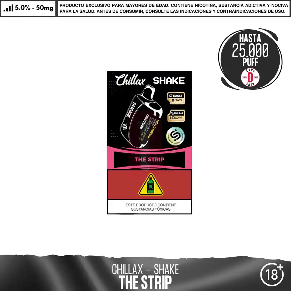 Chillax - Shake 25000 PUFF El Chillax Shake 25000 puffs es un dispositivo desechable diseñado para ofrecer una experiencia prolongada con hasta 25,000 inhalaciones. Su construcción compacta y ligera facilita su manejo y transporte, mientras que su sistema avanzado asegura una producción constante de vapor y sabor. Concentración de nicotina: 5% de nicotina salina en peso Características del dispositivo: Dispositivo de vapeo desechable Pantalla digital Material: PVC + Silicona Modo Boost activable con triple sacudida (“Triple Shake Boost”) 20 ml de líquido prellenado 5% de sal nicotina = 50mg / ml 1 dispositivo por paquete Batería: 650 mAh, Puerto de carga USB-C 25000 caladas aproximadamente en modo ECO Ingredientes: Glicerina Vegetal, Propilenglicol, Aromatizantes Naturales y Artificiales, Ácido Benzoico, Nicotina. Advertencia: Contiene nicotina, que puede ser venenoso. Evitar el contacto con la piel y los ojos. No ingerir. Mantener siempre en empaque original y en un ambiente fresco y seco. Mantener alejado de niños y mascotas. No debe utilizarse por Mujeres en estado de embarazo o personas con problemas de respiración como el asma. En caso de accidente contacte a la línea 123. Producto para mayores de 18 años.