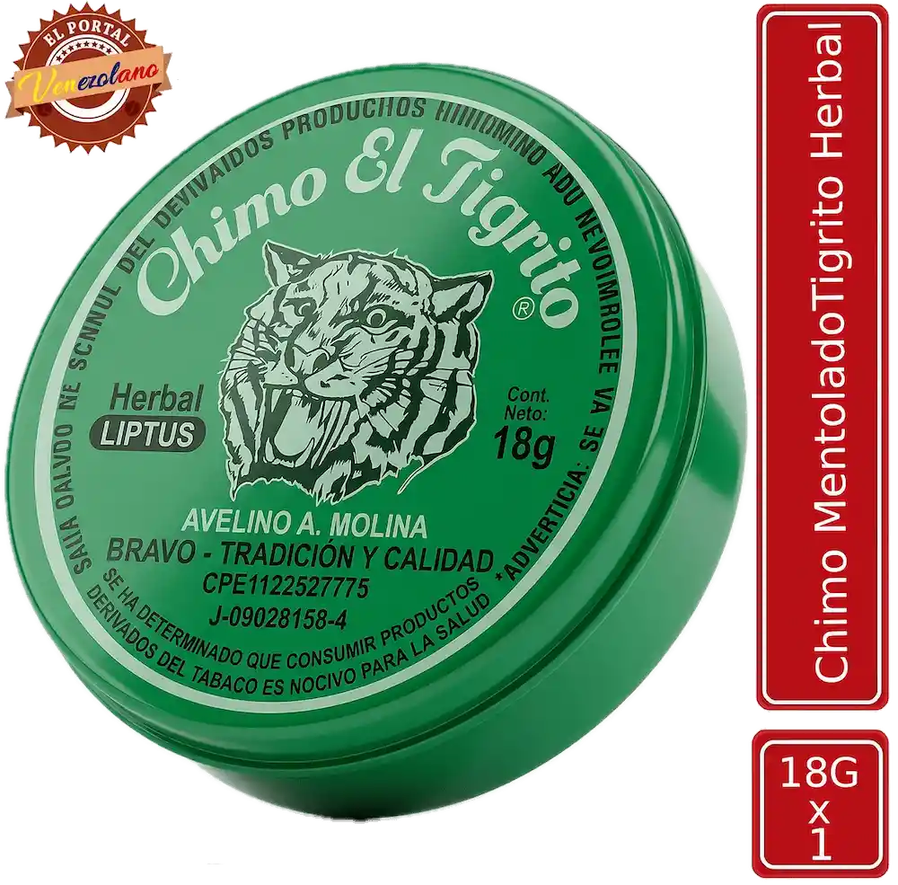 Está compuesto por una pasta de chimó “a base de tabaco” con sabor herbal liptus, especies aromatizantes, edulcorantes naturales, carbonato de sodio y espesantes naturales. Su presentación viene en unidades de 18 gramos, en envase plástico de color verde.