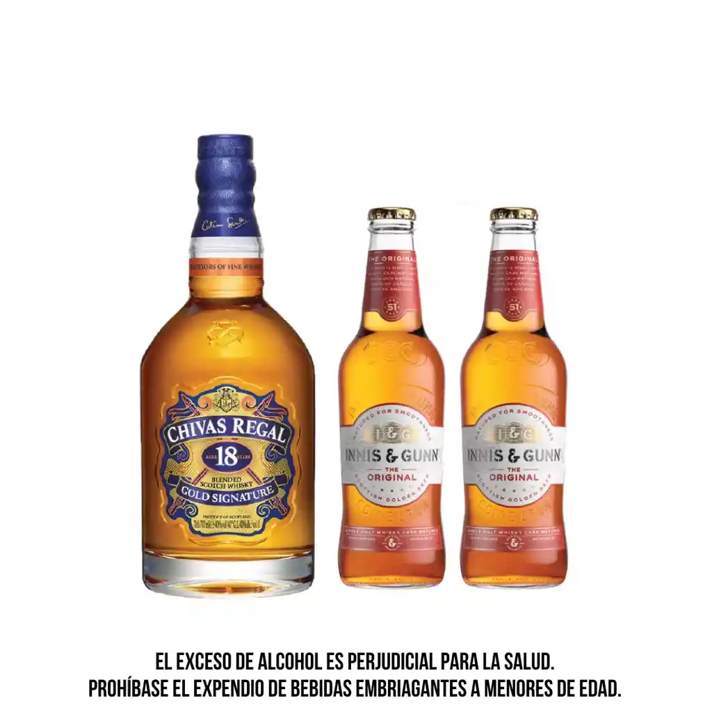 Disfruta un combo premium ideal para regalar o compartir. Incluye una botella de Whisky Chivas Regal 18 años de 700 ml, reconocido por su suavidad, notas de frutos secos, chocolate oscuro y un elegante toque ahumado. Como obsequio, recibe 2 cervezas Innis & Gunn Original, una cerveza escocesa con maduración en barrica que ofrece un sabor suave y equilibrado. Perfecto para celebraciones, regalos especiales o para disfrutar de una experiencia única con un whisky de alta gama acompañado de una cerveza premium. Incluye: 1 Whisky Chivas Regal 18 años 700 ml 2 Cervezas Innis & Gunn Original (obsequio)
