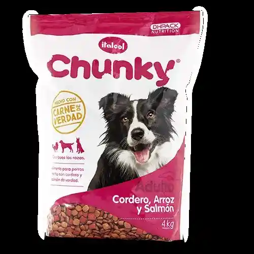 Chunky Cordero (generalmente con Salmón y Arroz) destaca por ser hipoalergénico (ideal para pieles sensibles), promover un pelaje brillante y piel sana (gracias a Omegas 3 y 6), facilitar la digestión (con arroz) y ofrecer alta palatabilidad (saborizante natural con carne de verdad), brindando nutrición completa y balanceada para perros adultos y cachorros, sin colorantes artificiales.