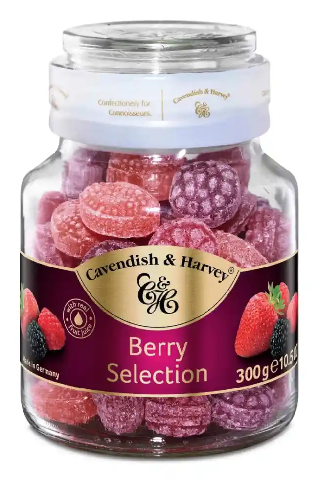 Frasco de vidrio de lujo que contiene deliciosos dulces de fresa, frambuesa y moras hechos con jugo de fruta real.