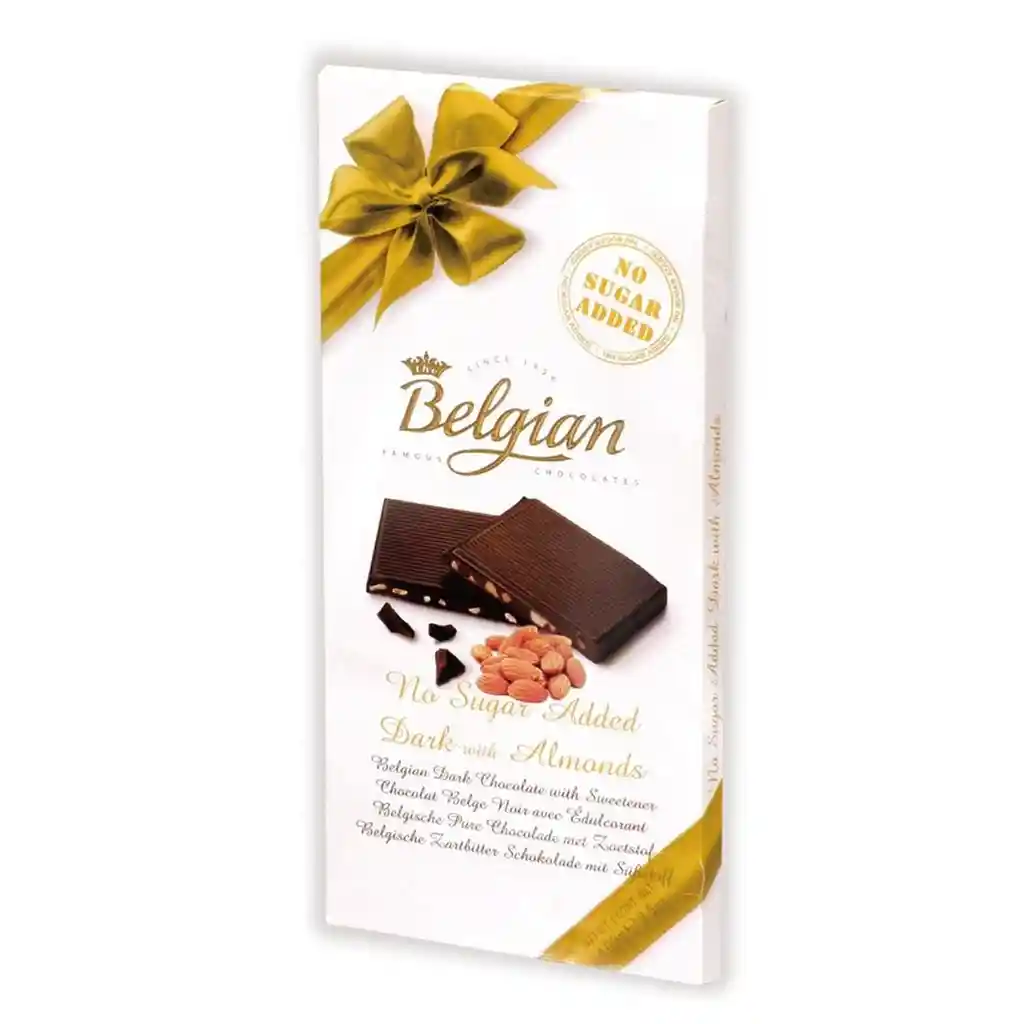 Barra De Chocolate Belgian Amargo Sin Azucar Con Almendras. Producido Por The Belgian Chocolate Group Nv. Ingredientes Pasta De Cacao, Almendras 10%, Emulgente Leticina De Soya, Aroma Natural, Vainilla.