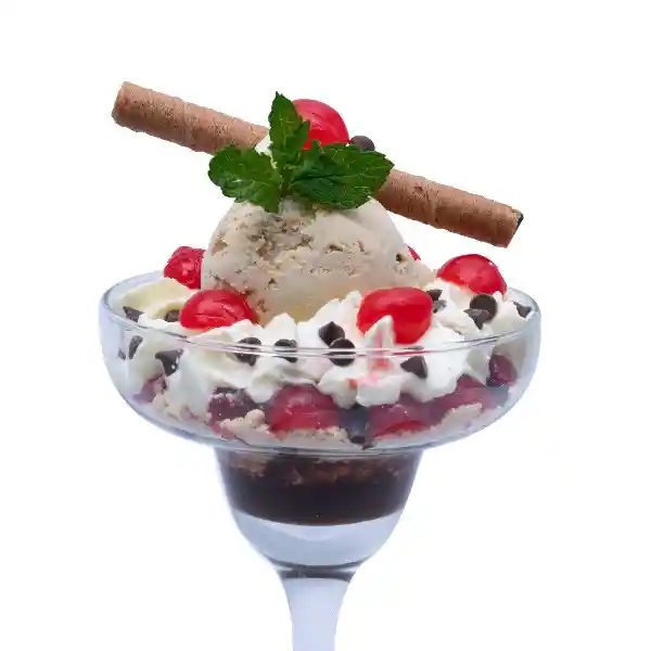 Base de brownie, cerezas, galleta triturada, chantilly, chips de chocolate, helado y barquillo