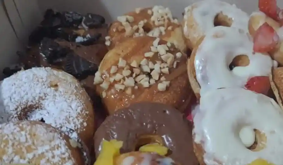 Mini Donas mixtas cobertura de chocolate negro y cobertura de chocolate blanco con grajeas surtidas.