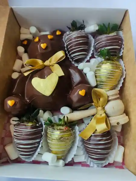 Choco piñata en forma de oso diamante de chocolate rellena de gomitas, galletas y mm aompañada por 6 fresas cubiertas de chocolate y masmelos