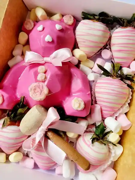 Choco piñata en forma de oso diamante de chocolate rellena de gomitas, galletas y mm aompañada por 6 fresas cubiertas de chocolate y masmelos