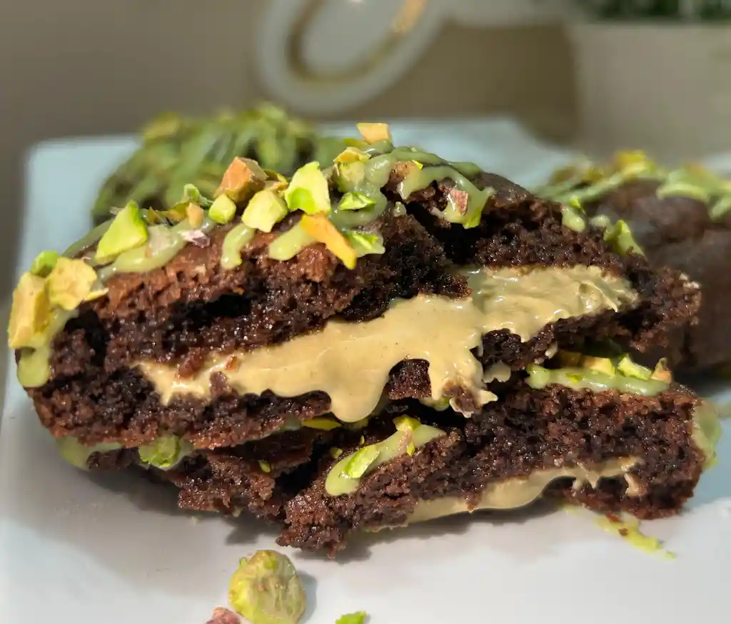 Galleta de chocolate es suave, oscura y profundamente chocolatosa. En su corazón, esconde un tesoro: un generoso y cremoso relleno de pistacho. El contraste de sabores es adictivo, una galleta perfecta para cualquier momento