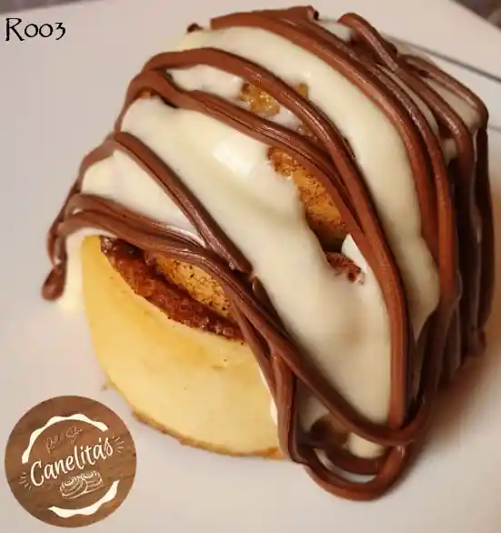 Delicioso roll de Canela con una base de Frosting y Full Top de Chocolate.