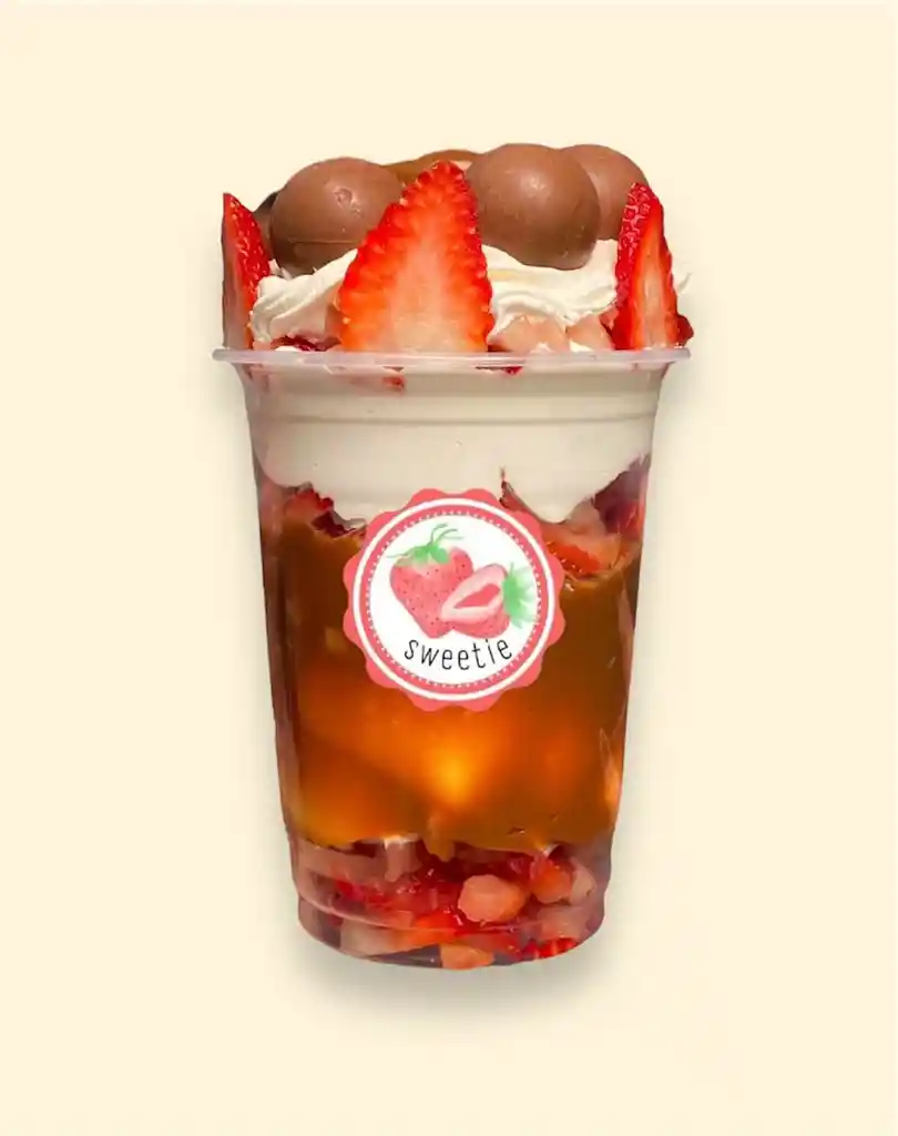 Fresas con crema grande, burbujas de chocolate jet y arequipe.