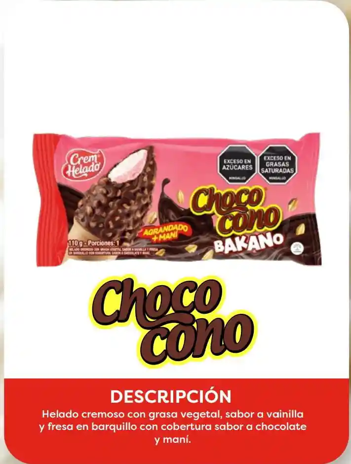 helado cremoso con grasa vejetal, sabor a vainilla y fresa en barquillo con cobertura sabor a fresa y mani