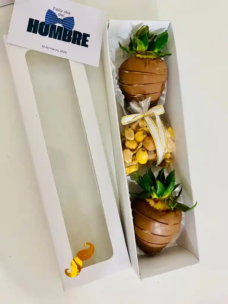 Lindo Detalle con 2 Chocofresas, frutos secos, en cajita con visor, Tarjeta y decoración.