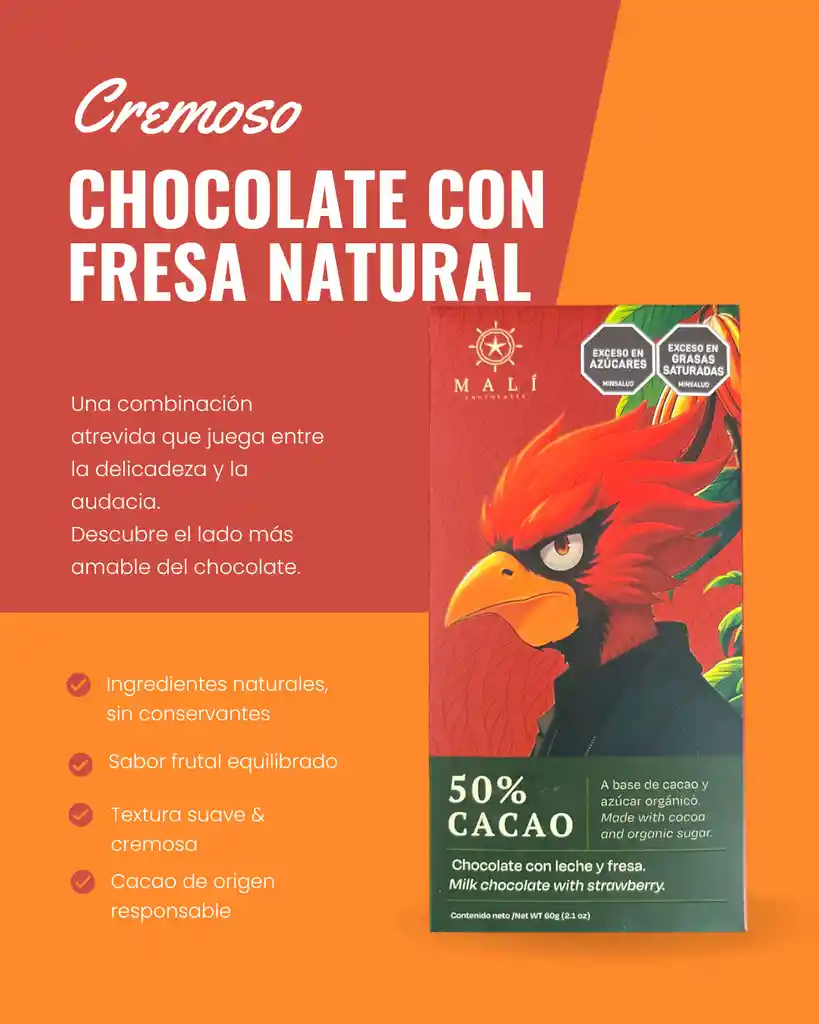 a intensidad profunda del cacao 🍫 abraza la cremosidad envolvente de la leche, mientras destellos de fresa despiertan la curiosidad de los sentidos. Una combinación atrevida, que juega entre la delicadeza y la audacia, como una historia de amor prohibida pero inevitable. ❤️🔥 🏷️ Ingredientes: Cacao orgánico, azúcar orgánico, manteca de cacao orgánica, fresa liofilizada, sal marina. 🔥 Notas de sabor: Cremosidad chocolatosa envolvente, fresa vibrante y un final muy frutal 🌍 Origen: Cordoba, con fresa intensa de excelente calidad. 🌱 Natural y auténtico: Sin conservantes ni aditivos innecesarios. Libre de gluten y Soja. De Origen único. ⚖️ Contenido neto: 60g (2.1oz) 🏆 Elaborado con pasión – Producido en pequeños lotes para garantizar calidad. Para máximo disfrute consérvese en lugar fresco lejos del sol.