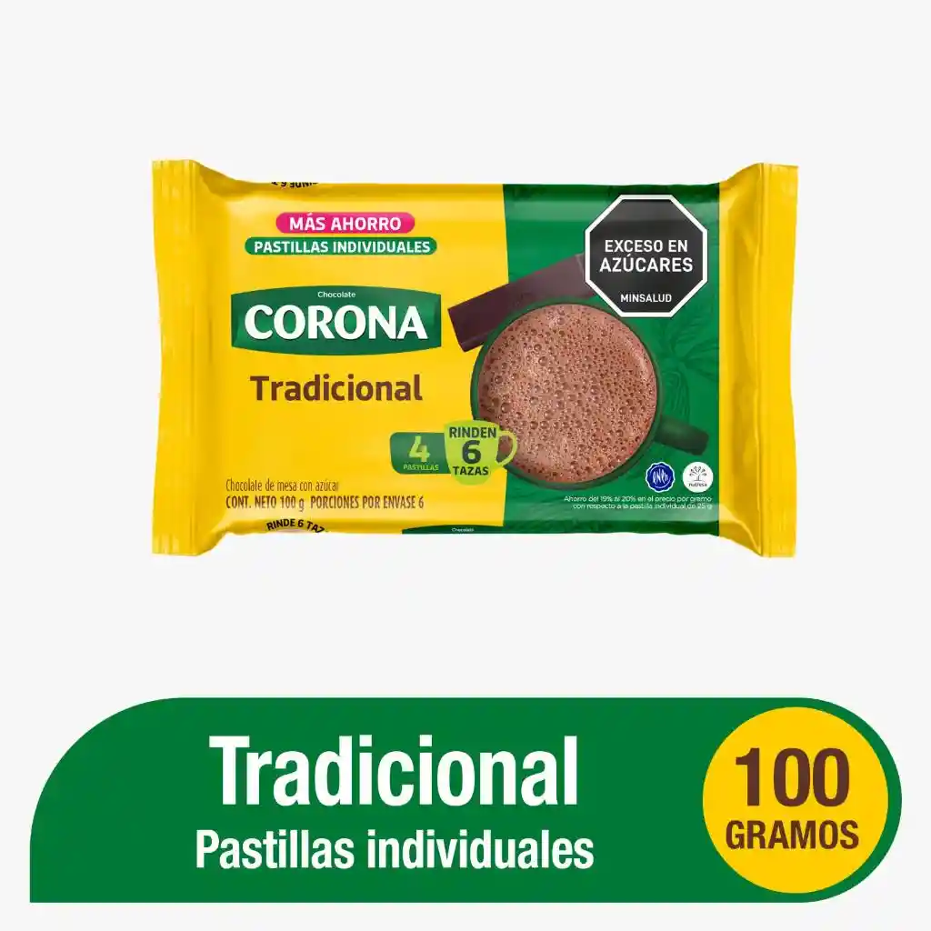 Chocolate Corona Tradicional en presentación de 100 g, ideal para preparar bebidas calientes, postres o disfrutar su sabor clásico.