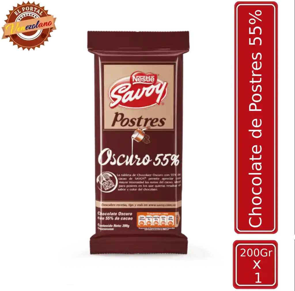 ****¡¡ DISFRUTA Y DESCUBRE LO MEJOR DE VENEZUELA!!*** Sabemos lo que significa extrañar los sabores auténticos de nuestra amada Venezuela. Por eso estamos aquí para brindarte una experiencia que te llevará directo a los recuerdos y emociones que creías estar lejos de alcanzar. ¿Quiénes somos? ¡Saludos! Somos Sindy y Daniel, y estamos emocionados de traerte lo mejor de Venezuela para que lo compartas con tus seres queridos. ¿Dónde nos encontramos? Nos encontramos relativamente cerca del Portal Norte ( Bogotá) ****CHOCOLATE DE POSTRE SAVOY***** ¡Eleva tus creaciones dulces con la intensidad del Chocolate Oscuro entre 40% hasta 55% de Cacao SAVOY®! Diseñado para los amantes del buen sabor, esta tableta de postres es la clave para transformar tus momentos en familia en experiencias deliciosas. Con un equilibrado entre 40% hasta 55% de cacao venezolano, cada bocado de esta joya chocolatera despierta los sentidos y añade un toque irresistible a tus recetas. Confeccionada con los mejores ingredientes, como la manteca de cacao y el licor de cacao de calidad premium, nuestra tableta de postres SAVOY® no solo aporta un sabor excepcional, sino que también eleva la calidad de tus preparaciones. Descubre la magia de cocinar con auténtico cacao venezolano y deja que tus postres se conviertan en obras maestras irresistibles. Para los que buscan más allá de lo convencional, nuestra tableta de postres SAVOY® es la elección perfecta. ¡Advertencia! Este producto puede contener maní, avellanas, almendras, leche y/o gluten. ¿Estás listo para transformar tus postres en experiencias inolvidables? ¡Descubre el secreto SAVOY® y sumérgete en el placer del chocolate de calidad superior!