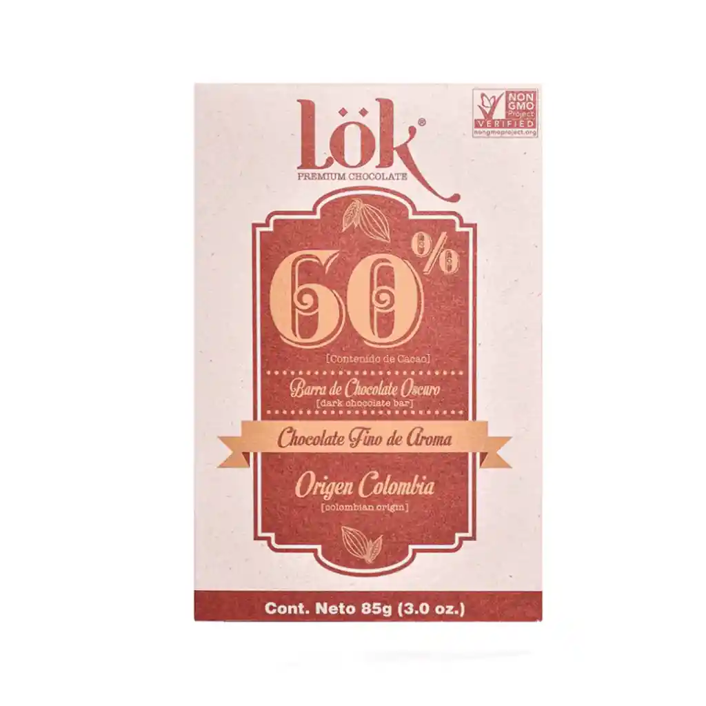Barra de chocolate Lök 60% contenido de cacao. Ideal para acompañar con un buen café, maridar con un vino tinto, y combinar con un snack de frutos secos.