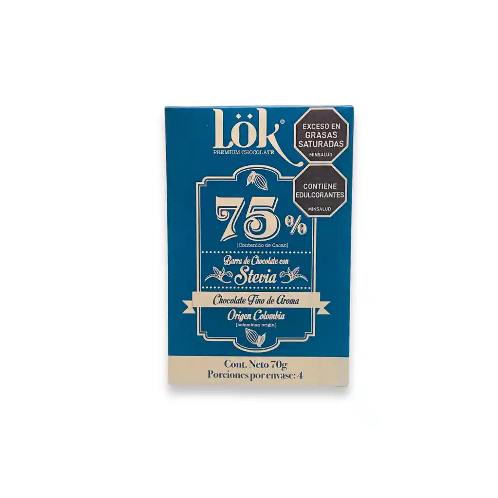 Disfruta la barra de chocolate Lök 75 % cacao 70 g con stevia, chocolate oscuro sin azúcar añadida, sabor intenso y balanceado. Ideal para quienes buscan placer y bienestar.