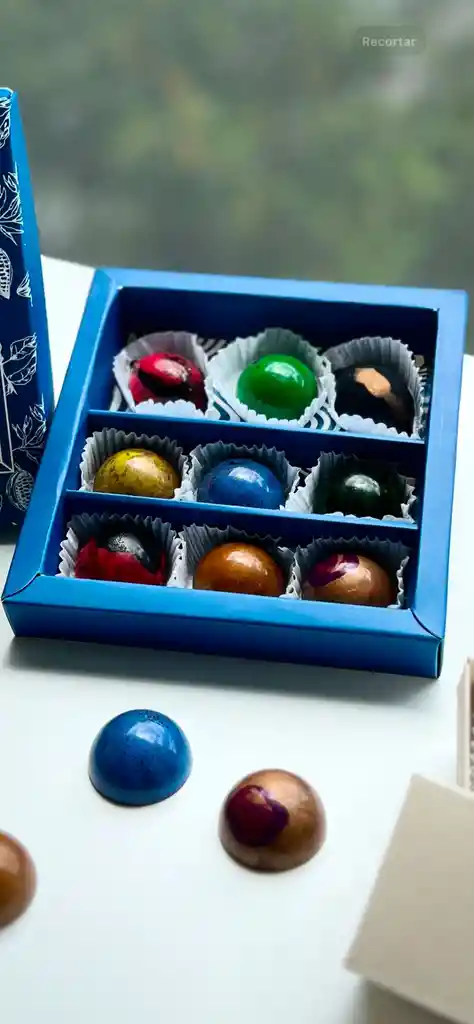 bombones de chocolate artesanal rellenos de ganache frutales y de licor, elaborados a mano, chocolate 100% colombiano