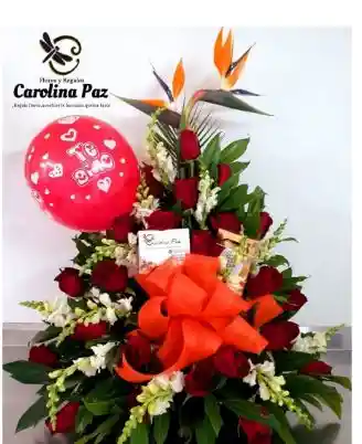 Arreglo floral elaborado en rosas rojas, boquitas, aves del paraiso y follajes, moño,globo tarjeta y chocolates Ferrero x 8 unidades.