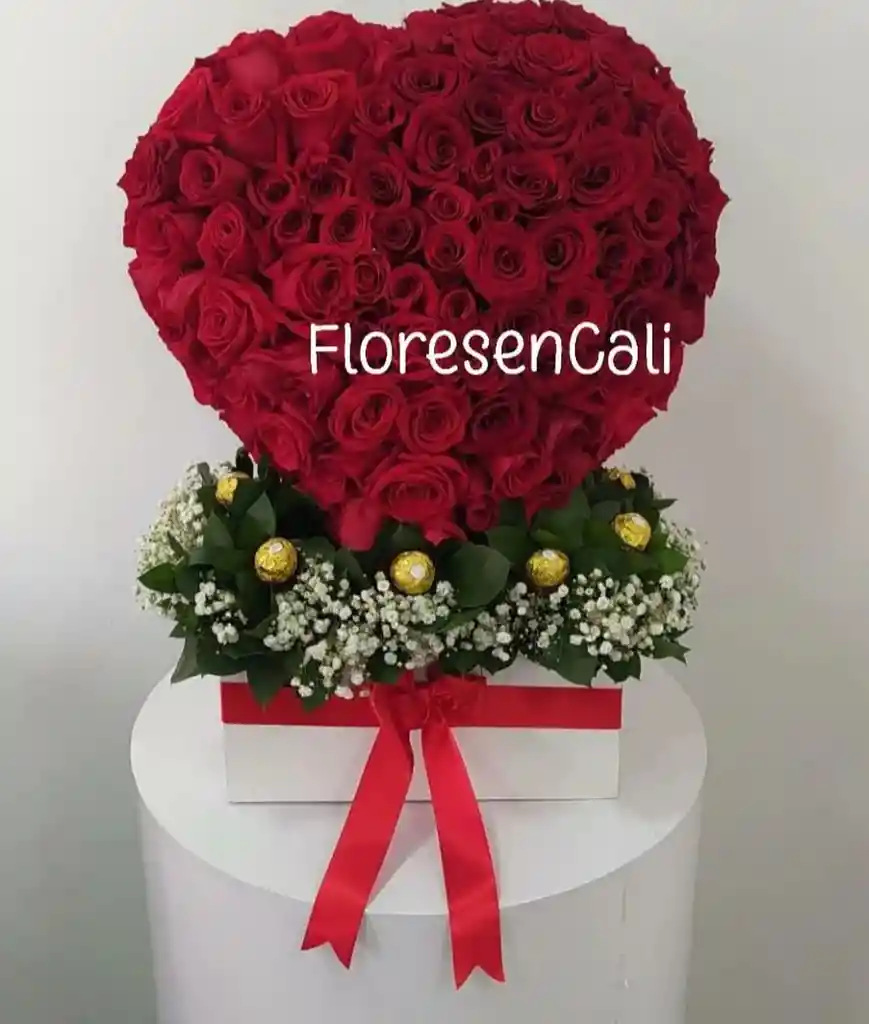 Arreglo rosas en forma de corazón acompañado con chocolates Ferrero