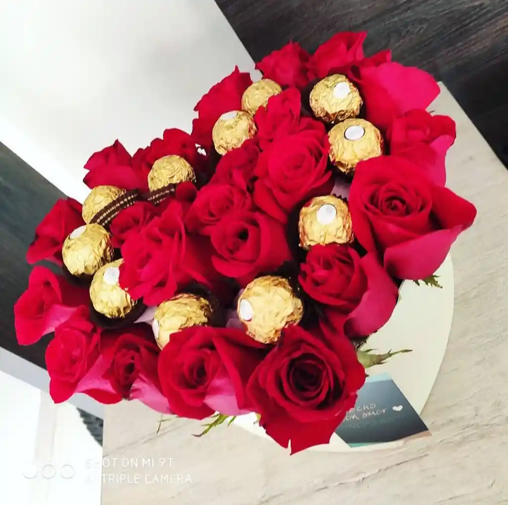 Caja en forma de corazón con 25 rosas junto con 11 chocolates Ferrero