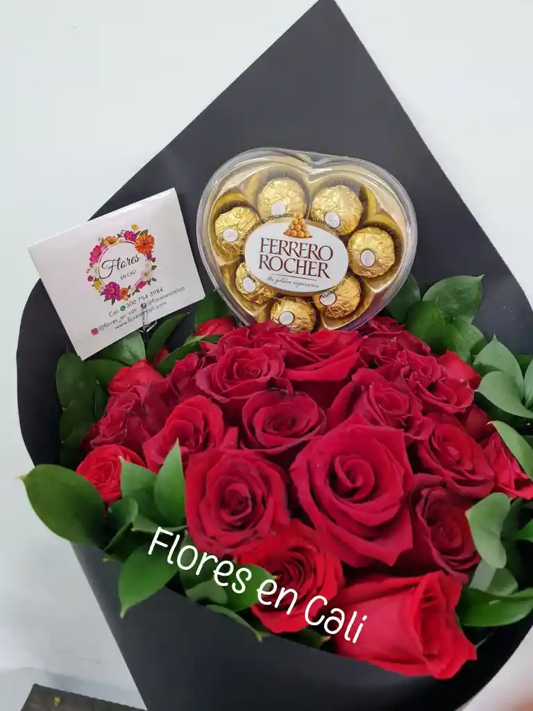 cono 24 rosas acompañados con chocolates Ferrero en forma de corazón