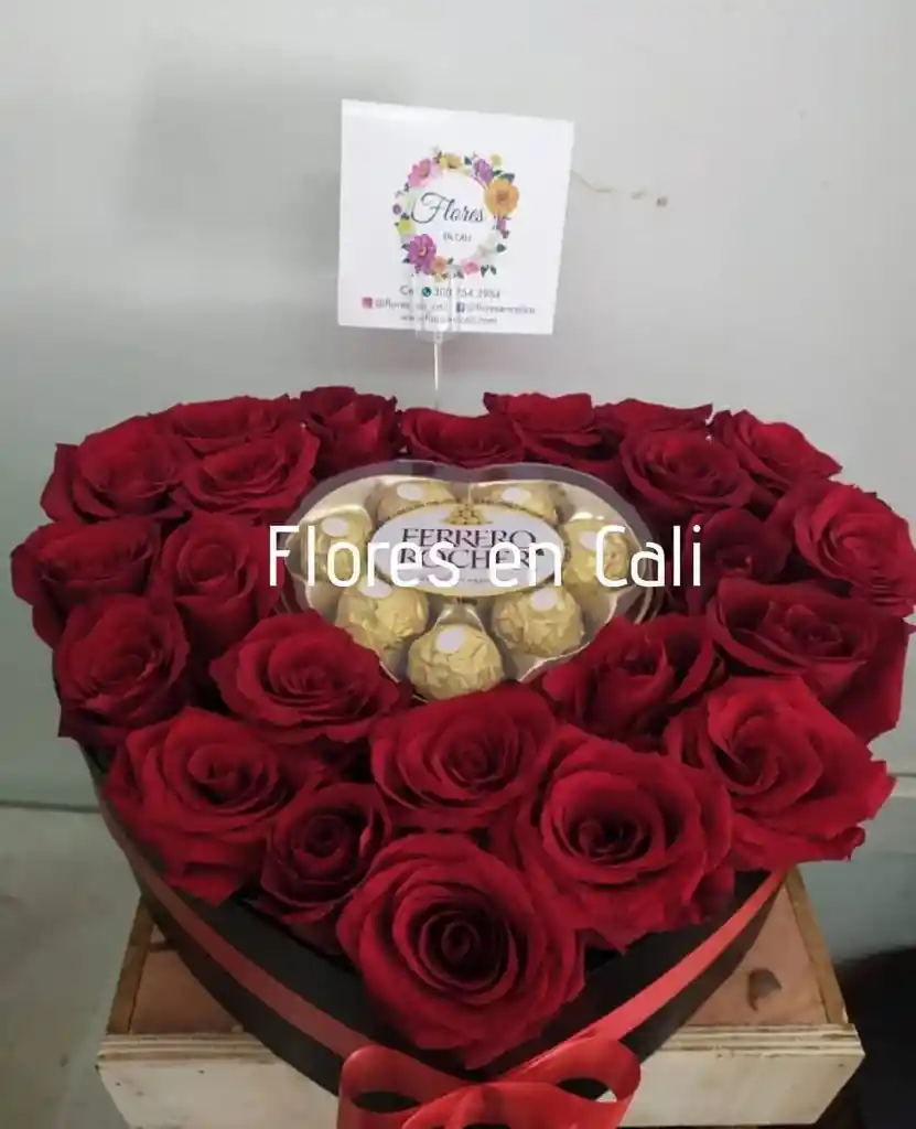Corazón de rosas acompañado con chocolates Ferrero