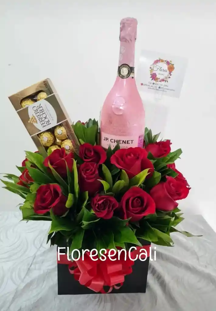 Cubo de rosas acompañado con caja de chocolates Ferrero y botella de jp