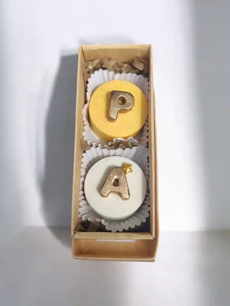 Caja de chocolates decorados delicada y cuidadosamente a mano especialmente para un ser muy importante, Papá! 2 unid de 4cm de ancho rellenos de coco y frutos amarillos. Caja de 10cm x 5cm Decorada con moño en cinta tela dorada